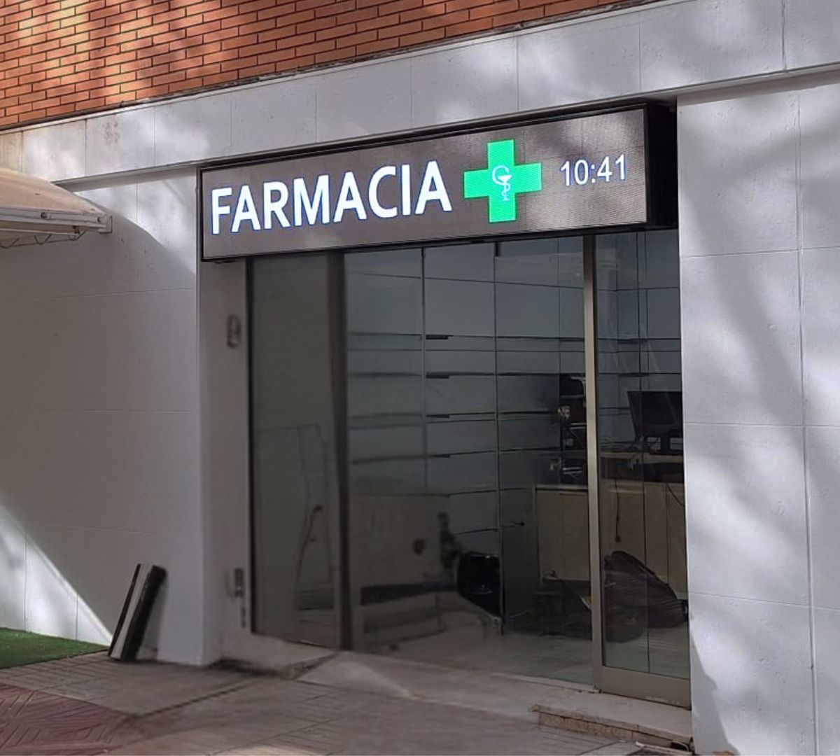 Instalación de una pantalla LED integrada en el rótulo principal de una farmacia en Salou. La pantalla permite mostrar información útil, promociones y mensajes de salud de forma dinámica, aportando visibilidad y modernidad al establecimiento, tanto de día como de noche.
