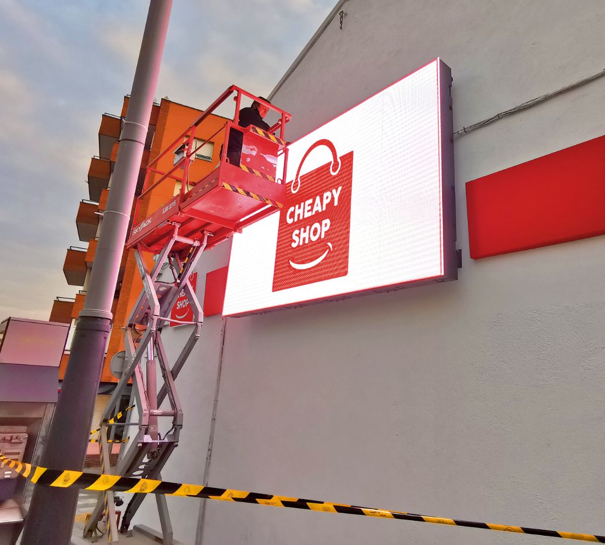 Instalación de una pantalla LED en la fachada de una tienda Cheapy Shop. Esta solución permite comunicar ofertas y promociones de forma dinámica y llamativa, reforzando la visibilidad del comercio y atrayendo la atención de los clientes desde la calle.